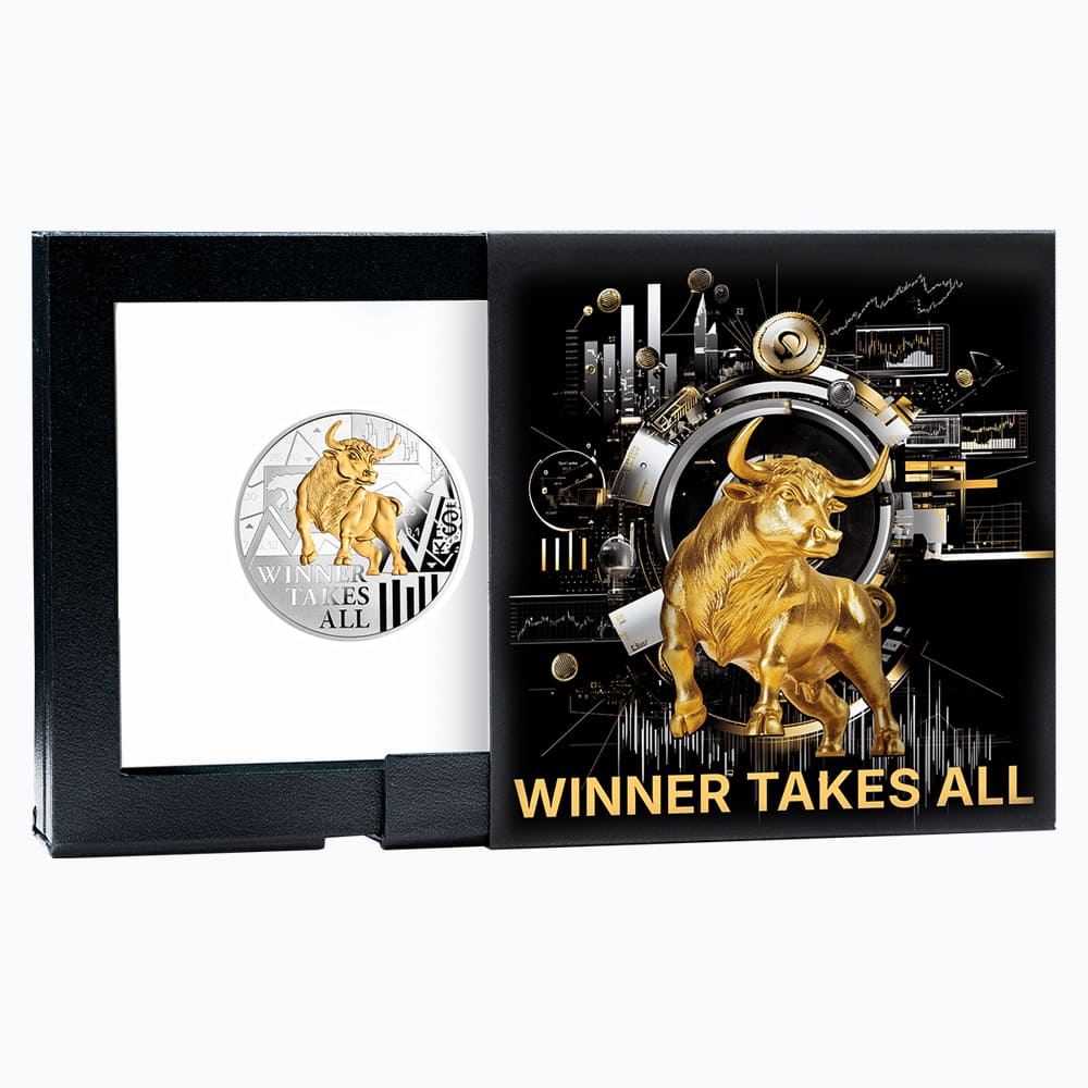 «Переможець отримує все» – це більше, ніж просто монета. Це визнання спраіжнього лідера, його амбіцій, стійкості та непохитності духу, сміливості йти першим та вести за собою. У центрі зображено золотого бика, позачасову емблему фінансової сили та рішучості, виконану за допомогою вибіркового золочення, яке відрязняється від іншої текстури та привертає увагу. Фон, заповнений біржовими графіками та валютними символами, відображає пульс сучасних ринків.